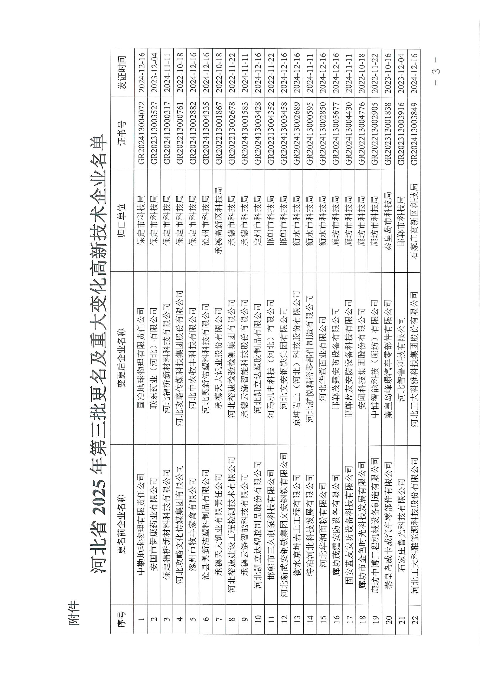 關(guān)于公布河北省2025年第三批更名及重大變化高新技術(shù)企業(yè)的通知